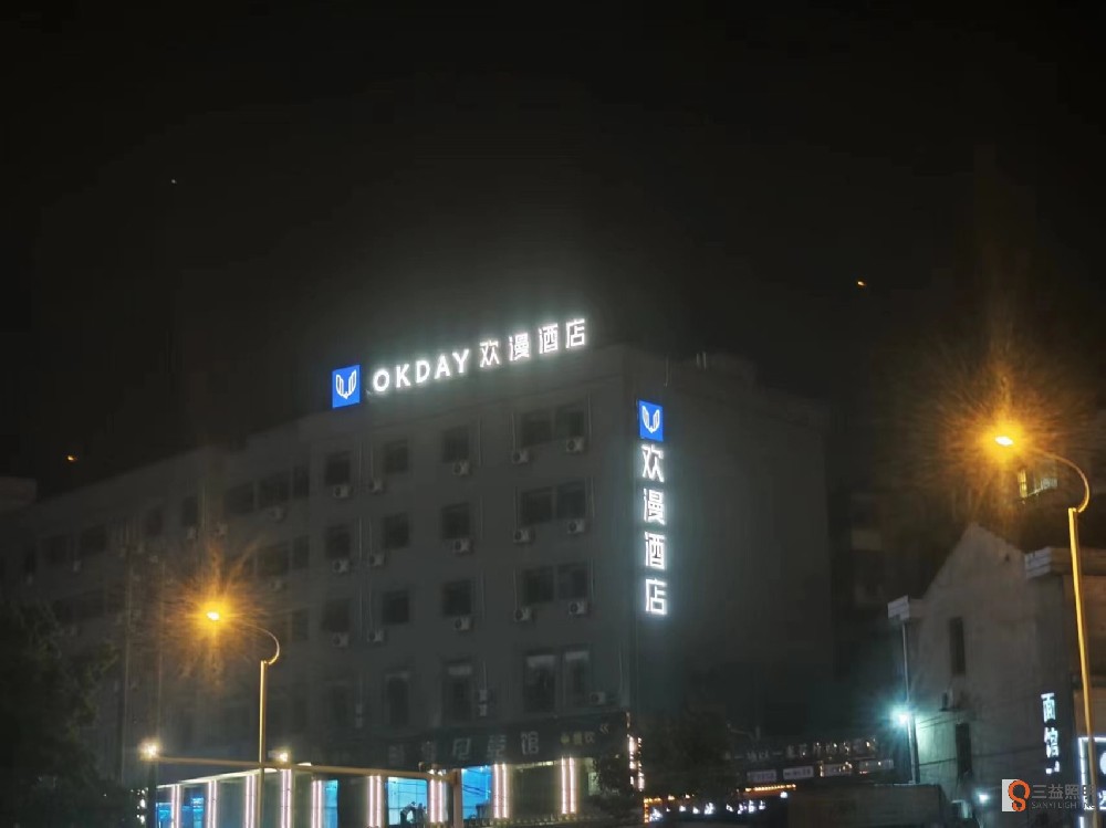 益陽市歡漫酒店外墻發(fā)光字采用不銹鋼制作面殼和底亮,亞克力面板,內置藍景光源,熱鍍鋅方通鋼架。