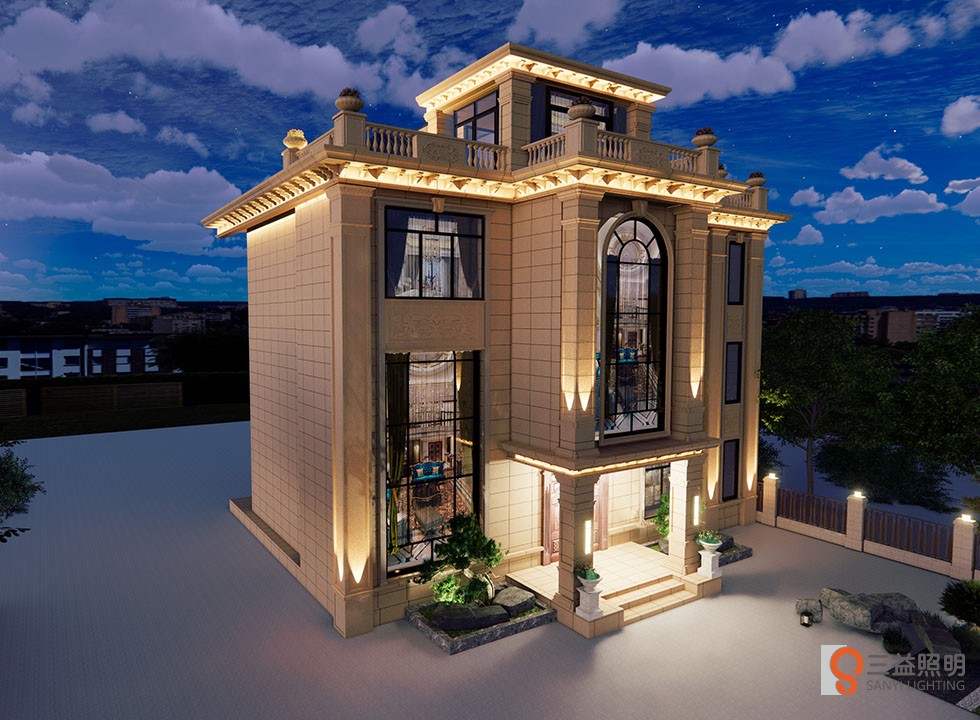別墅燈光采用3D漫游設(shè)計(jì),燈具采用專業(yè)工程款瓦楞燈、洗墻燈、LED投光燈、定制柱頭燈、壁燈、草坪燈等,整體燈光營(yíng)造浪漫、溫馨的環(huán)境。
